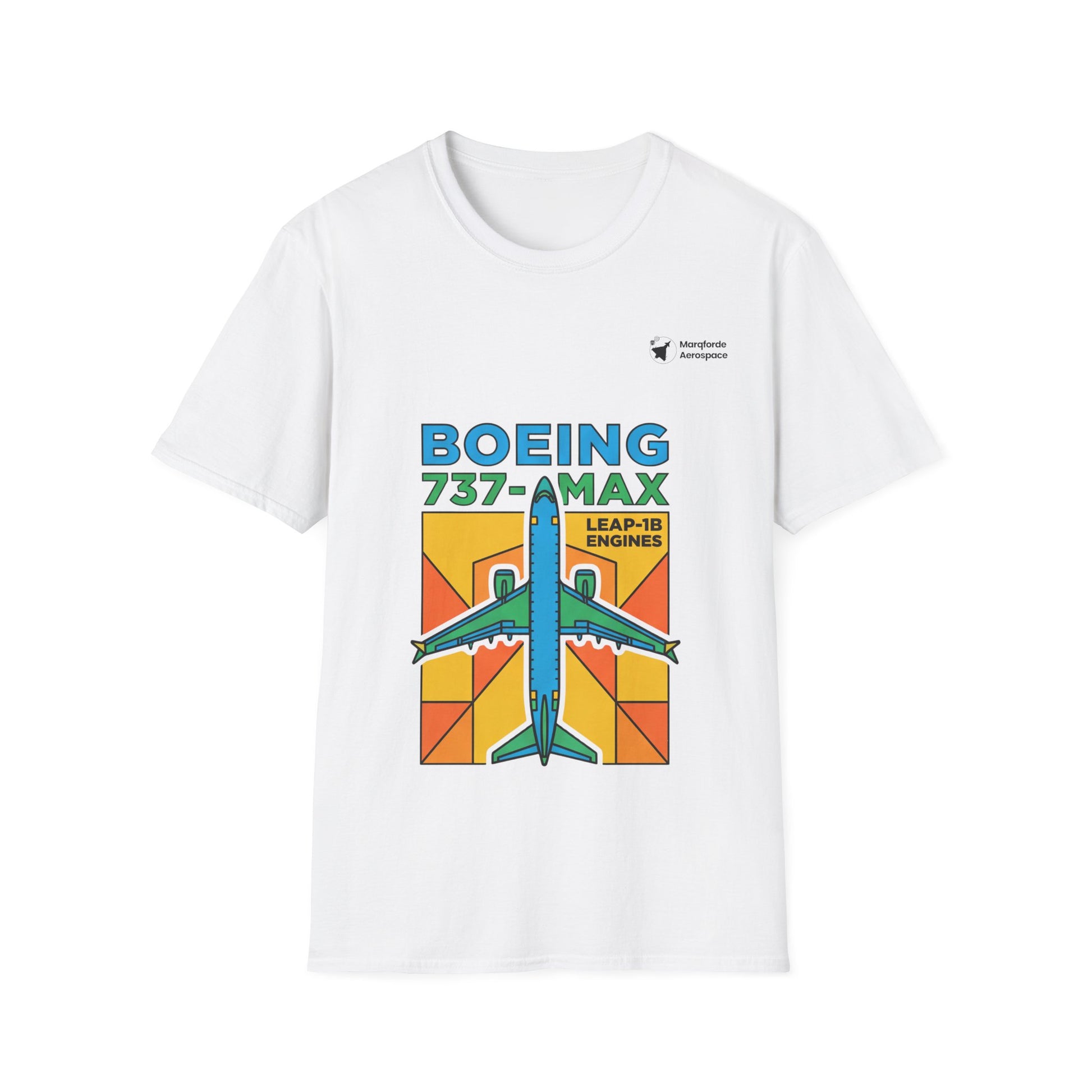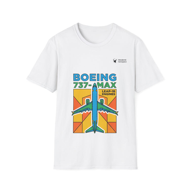 The Boeing 737 MAX sits centre stage on this white unisex tee, drawn in a bright, poster-style graphic with orange and yellow blocks that feel like golden-hour departures.