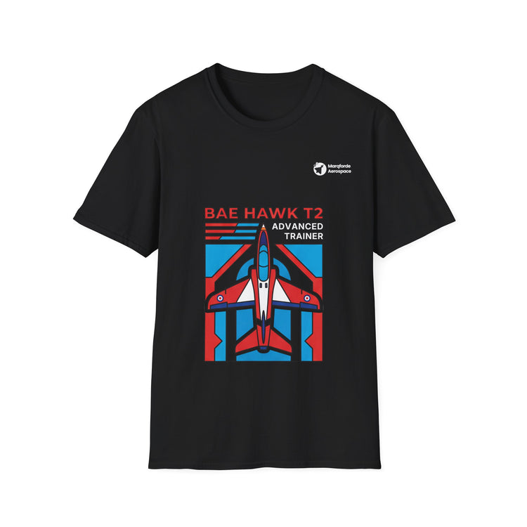 The BAE Hawk T2, backbone of modern RAF fast jet training, sits front and centre on this black unisex tee in a bold red, white and blue graphic that hints at squadron patches and display team vibes.