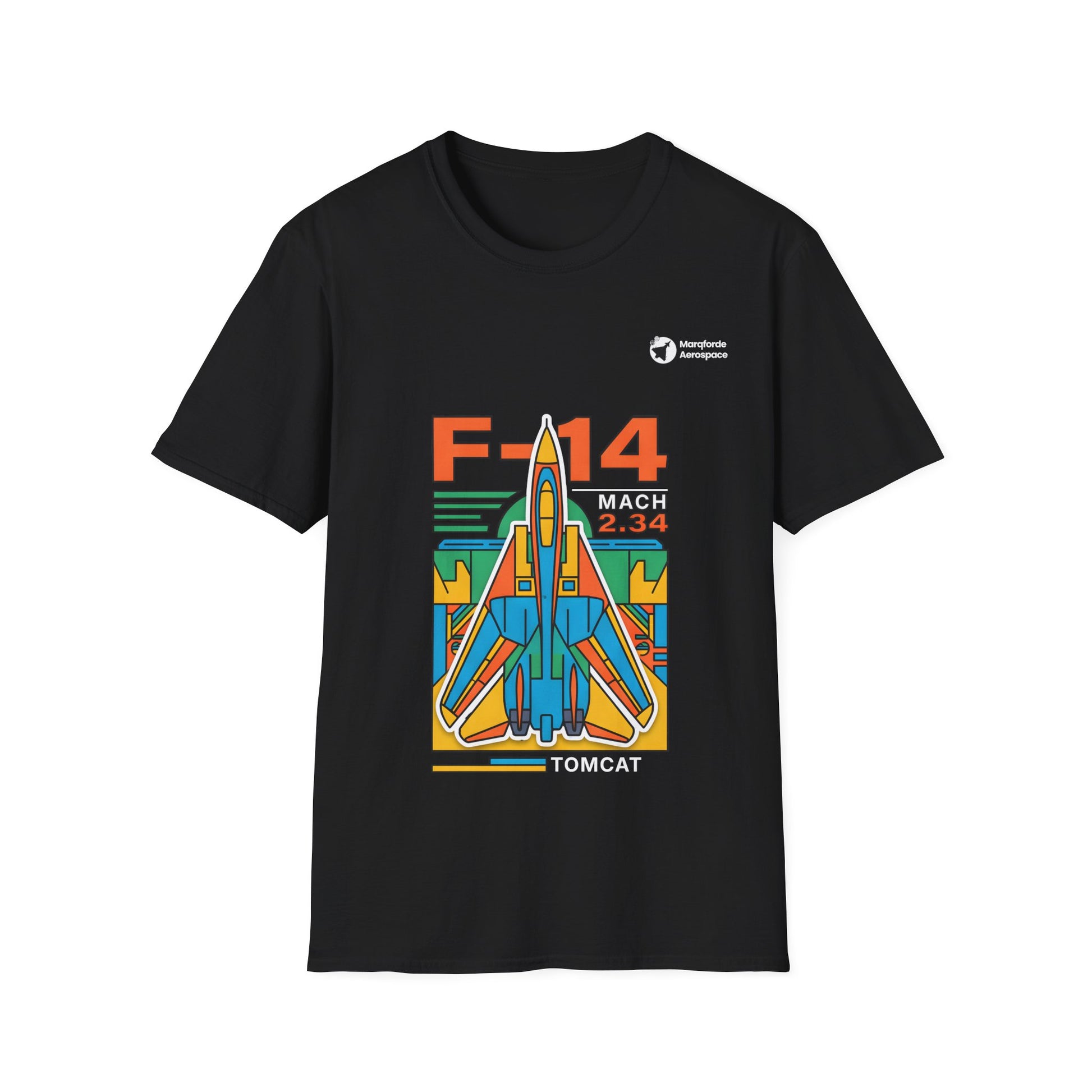 The F-14 Tomcat’s classic swing-wing outline dominates this black unisex tee, red, teal and yellow blocks giving it the same energy as an 80s arcade cabinet and carrier-deck patch rolled into one.